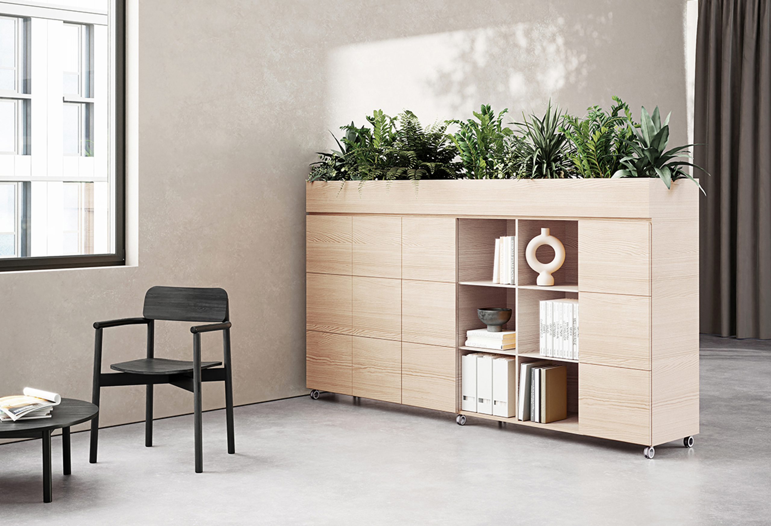 Aside from injecting practical storage space, the midboard is an ideal choice for organising open plan interiors and creating harmonious breakout areas, especially with the option to include planters.