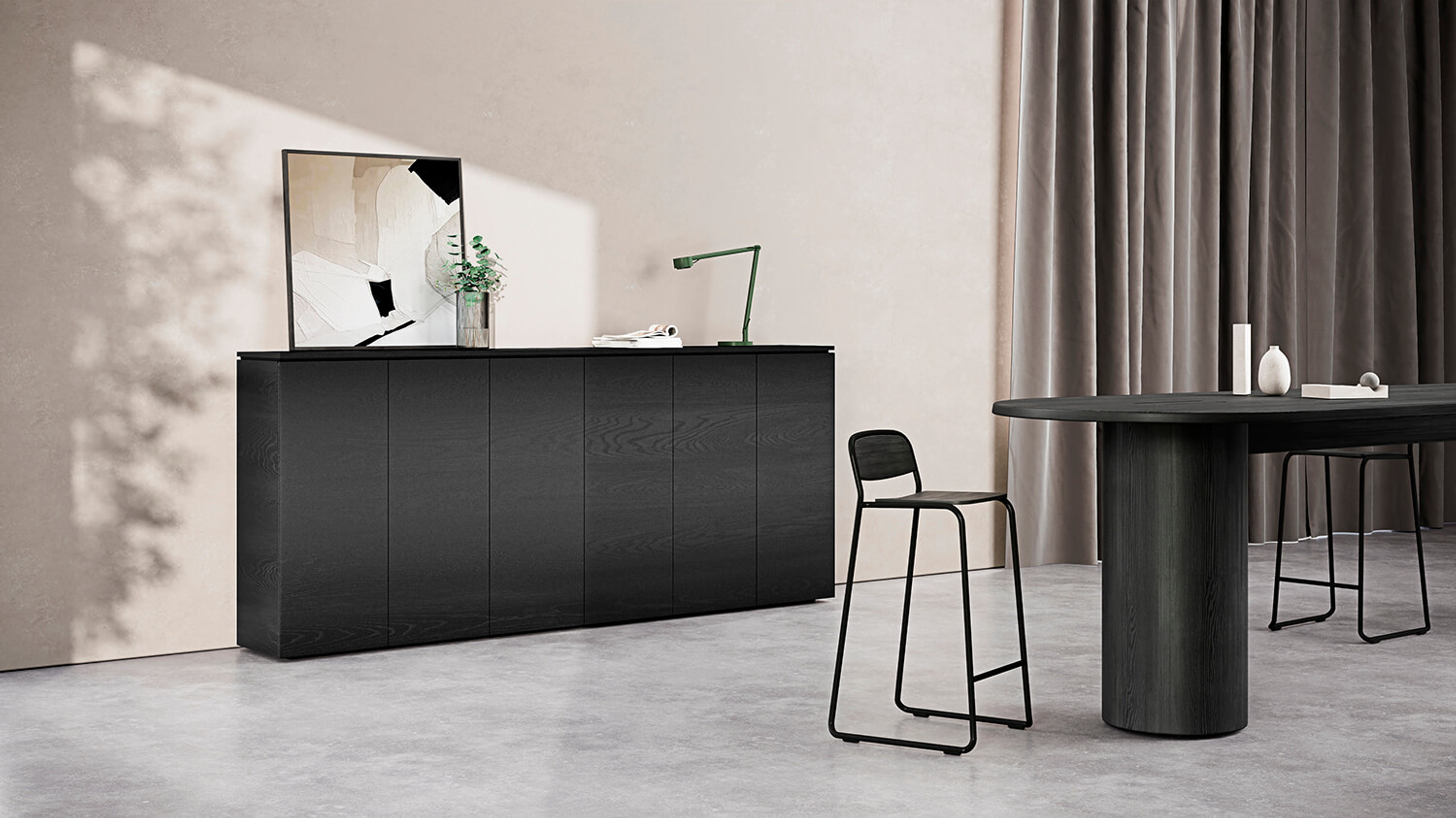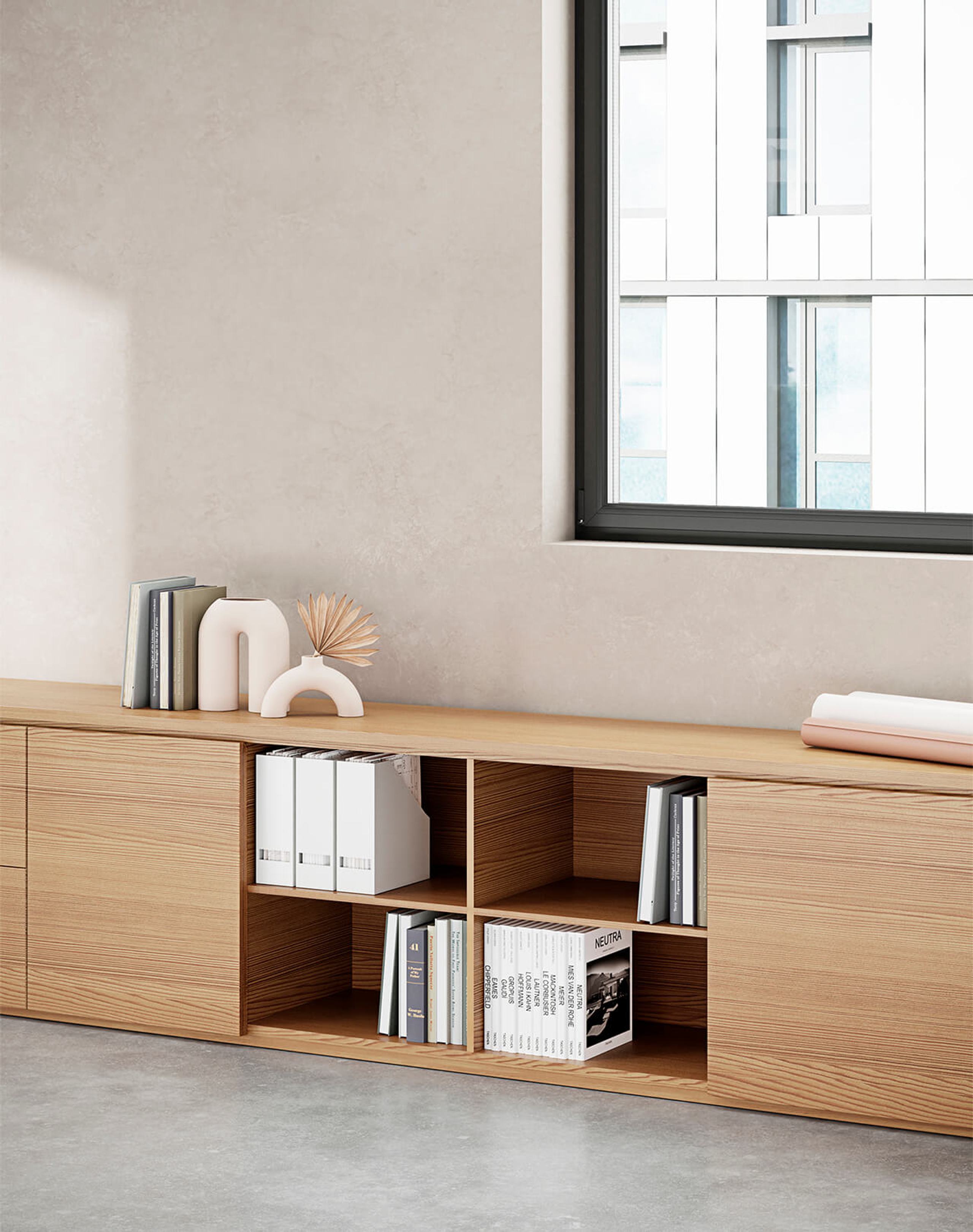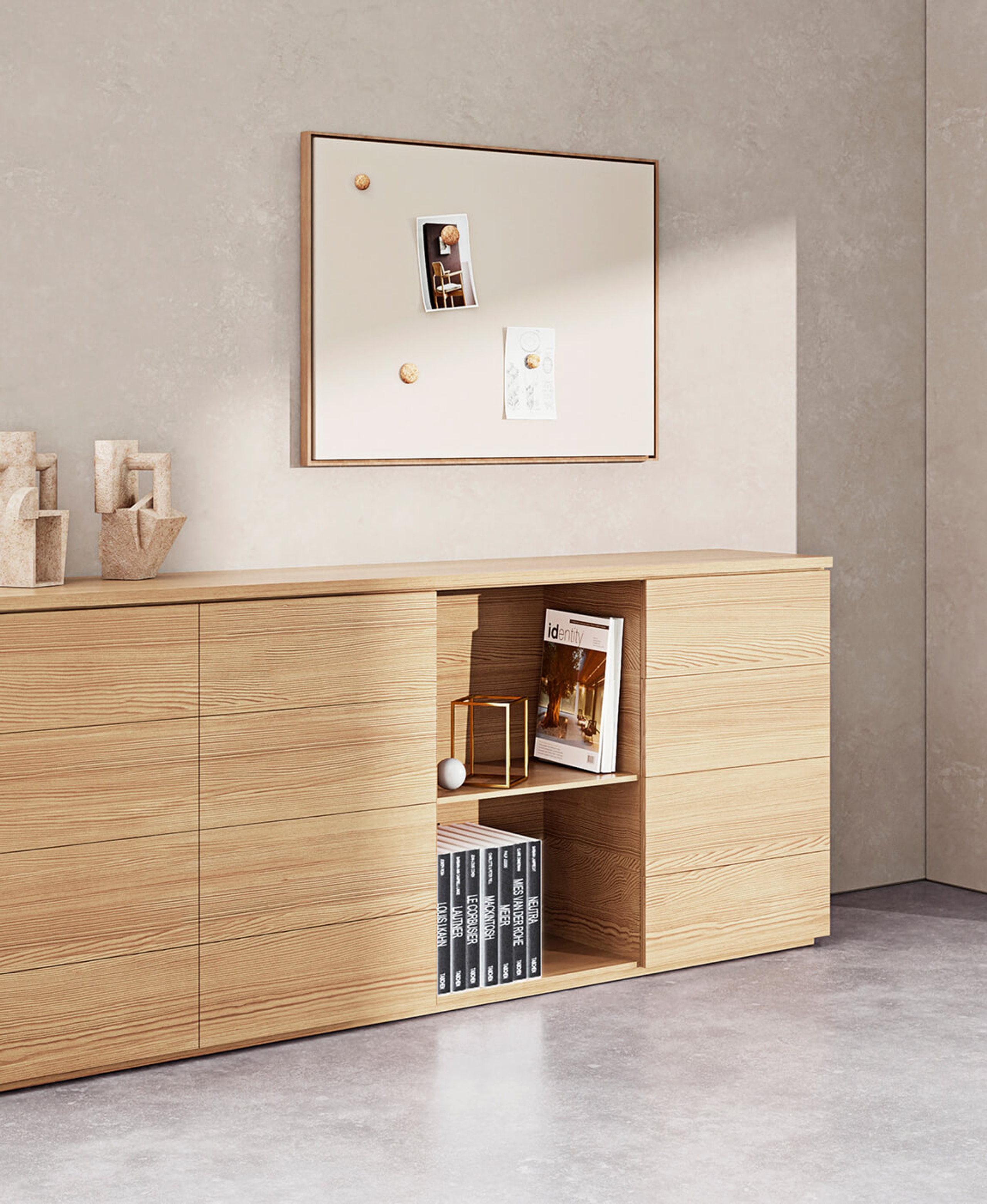 The endless system allows you to build different configurations, broken down into lowboards, sideboards, midboards, highboards and extra highboards. Each configuration is designed to complement and serve diverse spaces, synthesizing form and function.