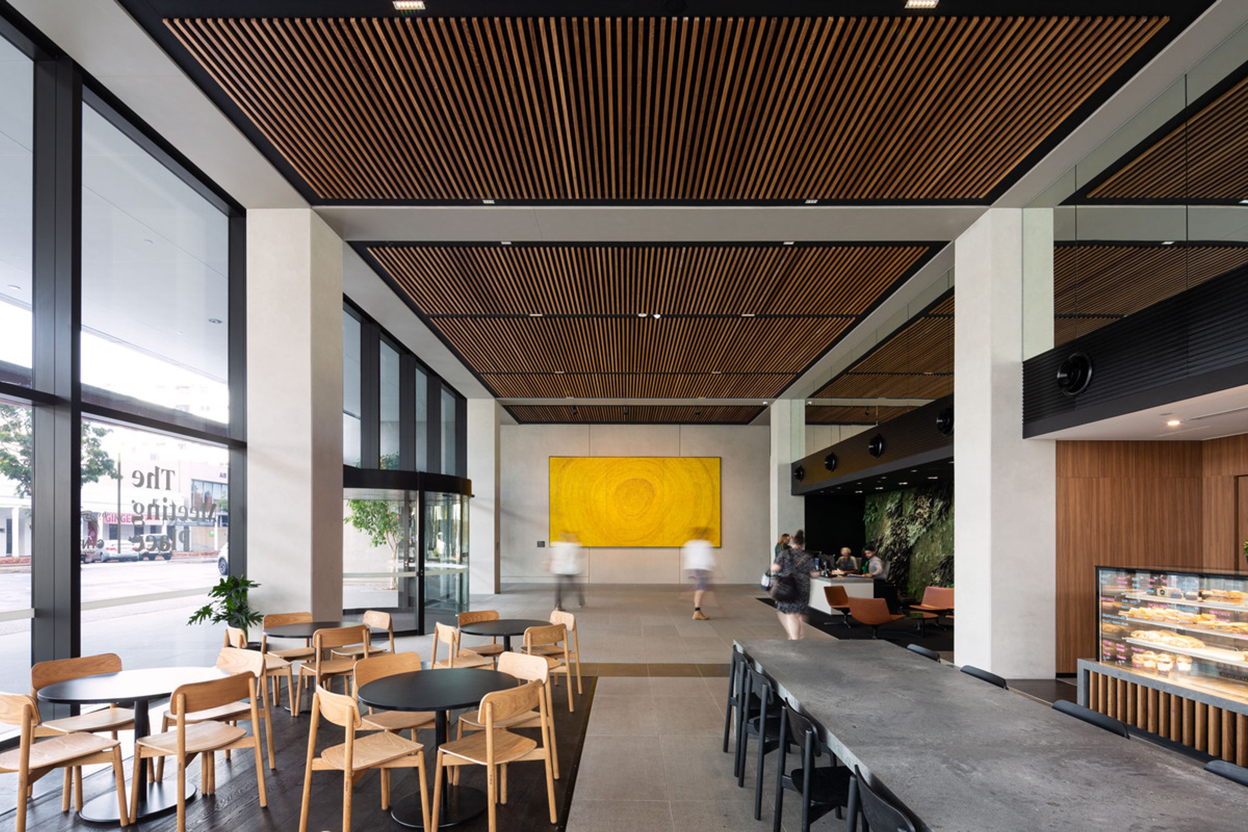Manunda Place was inspired by the top end – the tropical climate, the colour of the iron rich soils and the prevalence of lush planting. The site’s location presented an opportunity to regenerate this particular part of the Darwin CBD. It was previously occupied by a vacant building that added little to the streetscape and had effectively laid dormant for many years. We felt that there was an opportunity to reinvigorate the public domain with a high-quality building that provided generous shaded colonnades and widened footpaths to make it more welcoming. We were also very keen to assist with the re-greening of the city with new planting beds, street trees and upper balcony planting. This assists with the creation of cooler microclimates making the city a more comfortable and welcoming place to be. For us, the ground floor experience was a key component of our approach – the retail activation and the lobby café were seen to be opportunities for people to socialise, spend time and collaborate with others.