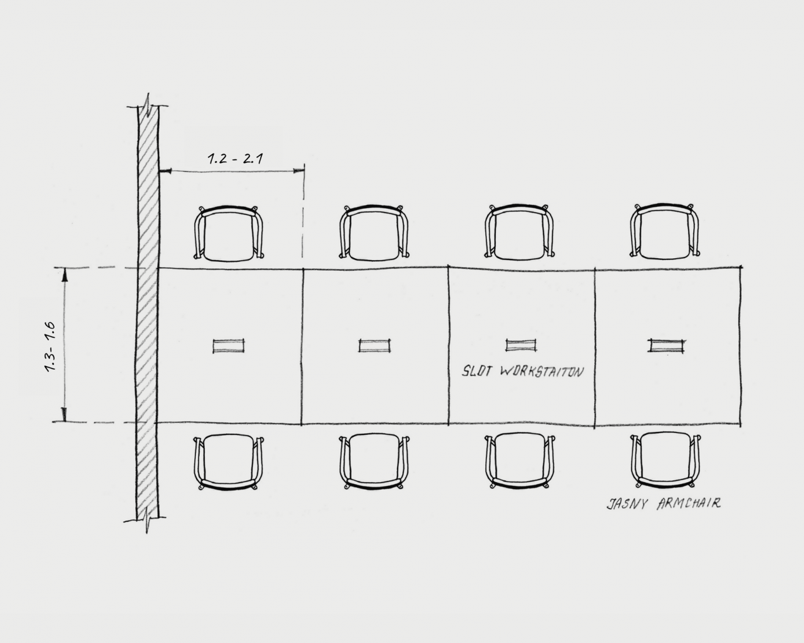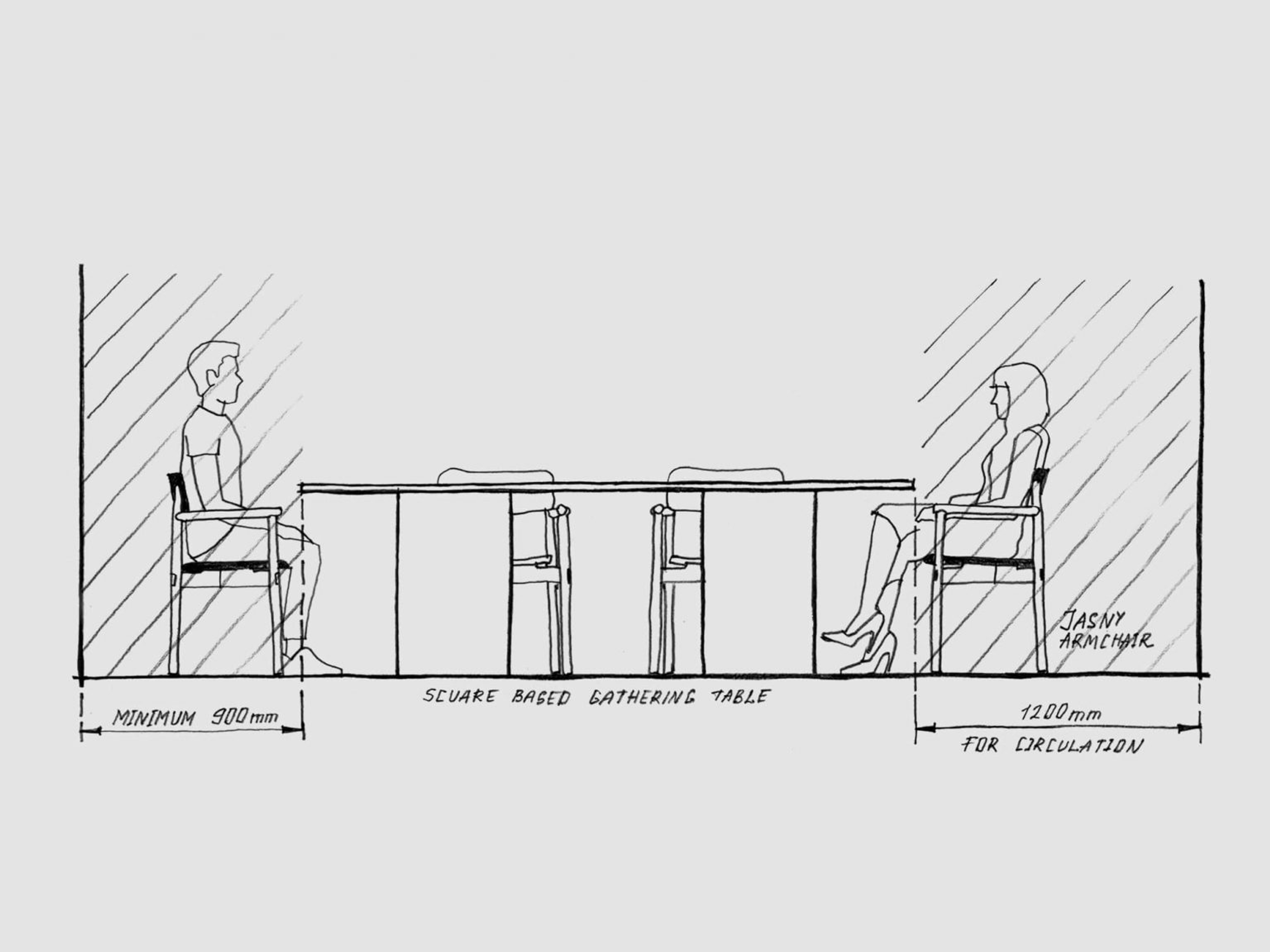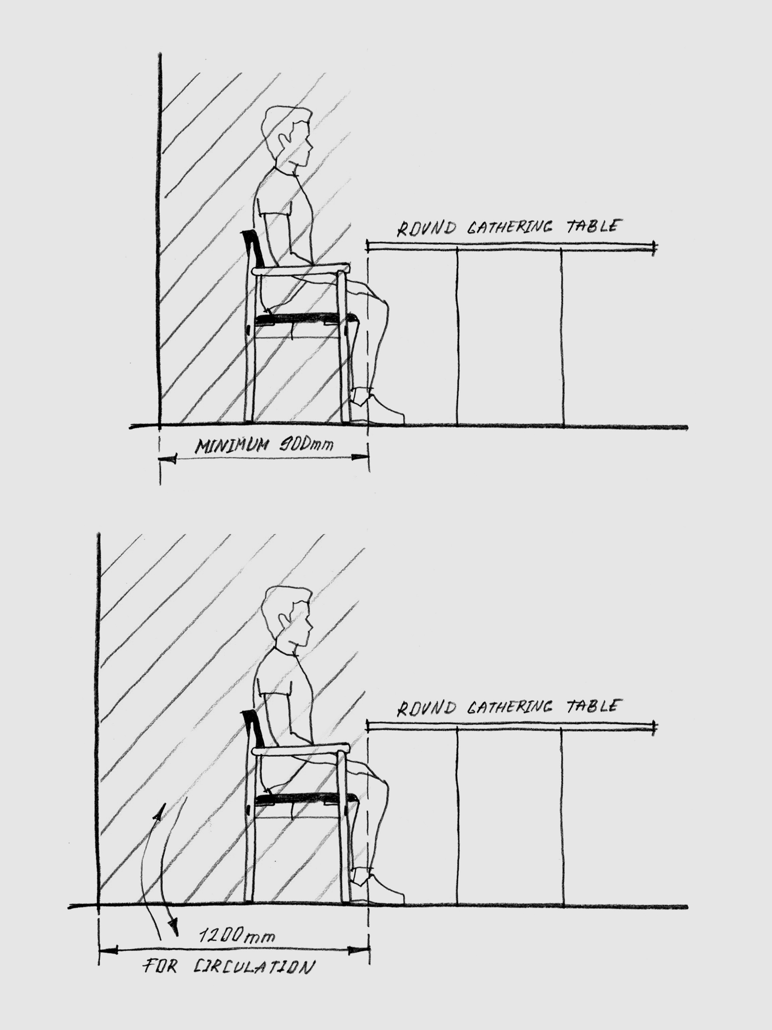 If a setting sits within an enclosed space where the occupant’s back is facing a wall, then a minimum of 900mm from the table edge to the wall is a comfortable distance. This should be increased to 1200mm for circulation.