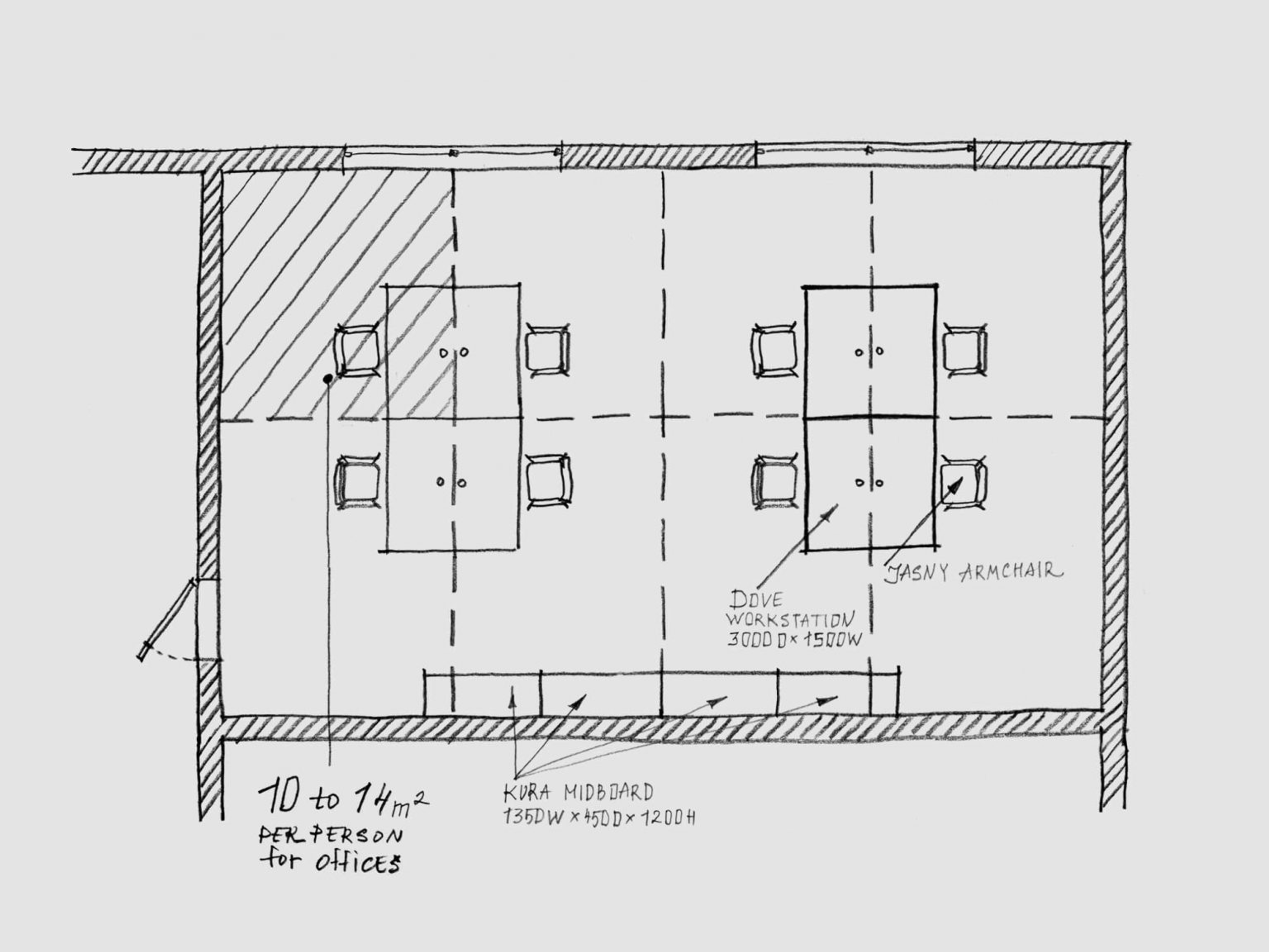 Meanwhile, if this setting is a workstation in a commercial setting, it is important to consult the Australian Standards. The Building Code of Australia recommends an overall 10 square metres per person for offices, including primary, secondary and tertiary spaces, but many companies prefer to estimate their spatial requirements from 12 to 14 square metres.
