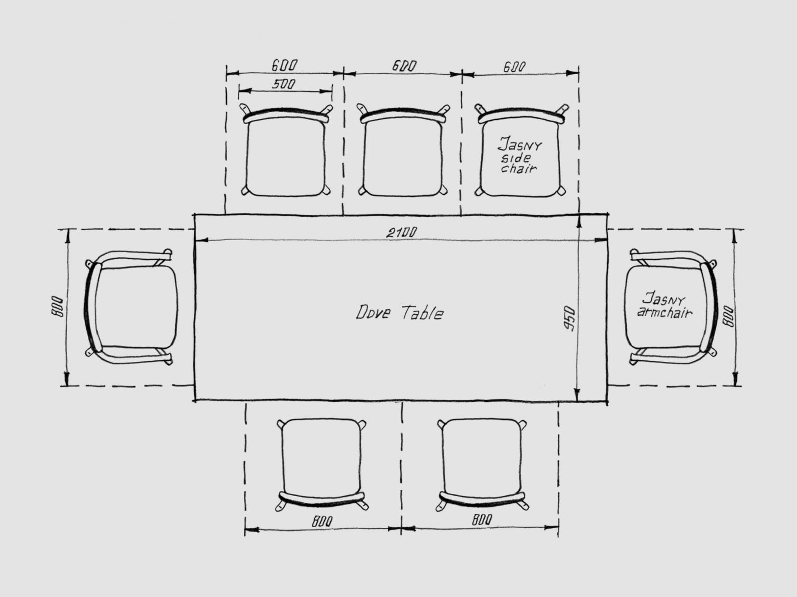 The next consideration is the number of seats. For a person to comfortably sit next to another, it is ideal to allow between 600-800mm per seat. Chairs with arms will lean towards the higher number rather than chairs without. To create some variance within the setting, specify armchairs at the heads of the table and side chairs for the sides.