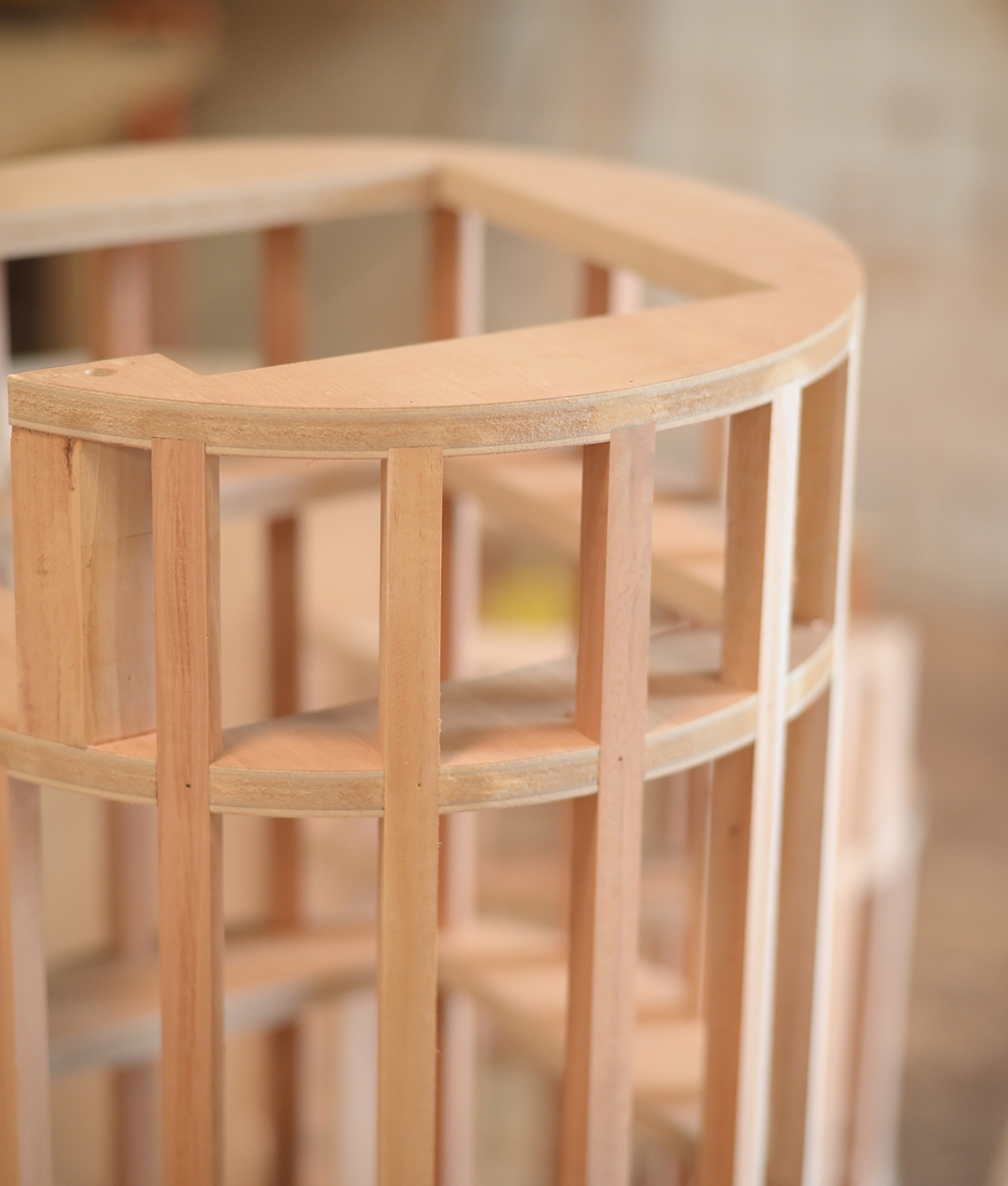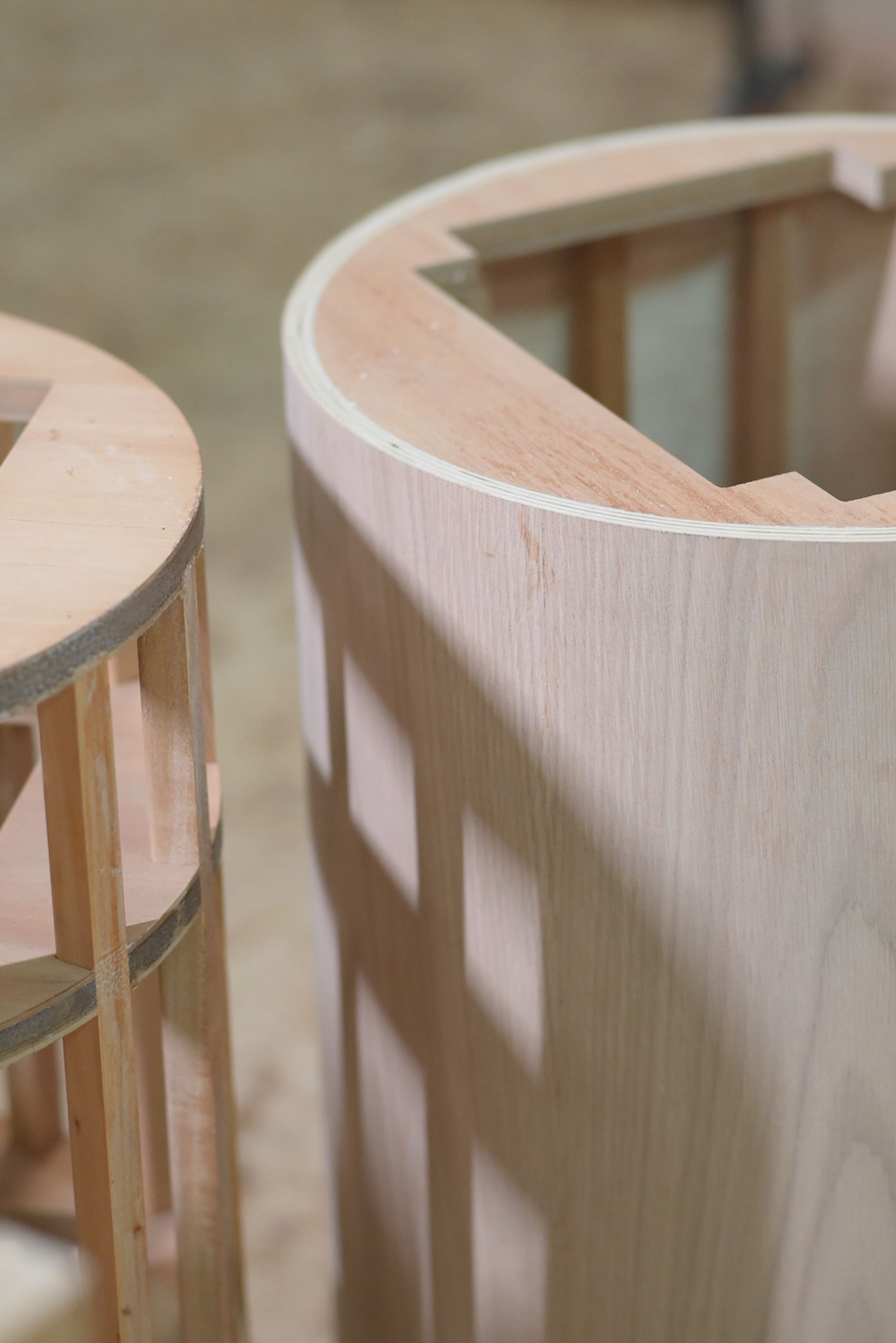 A specialised mold is then crafted to hot-press the plywood, shaping it into the distinctive rounded form that defines the table base.