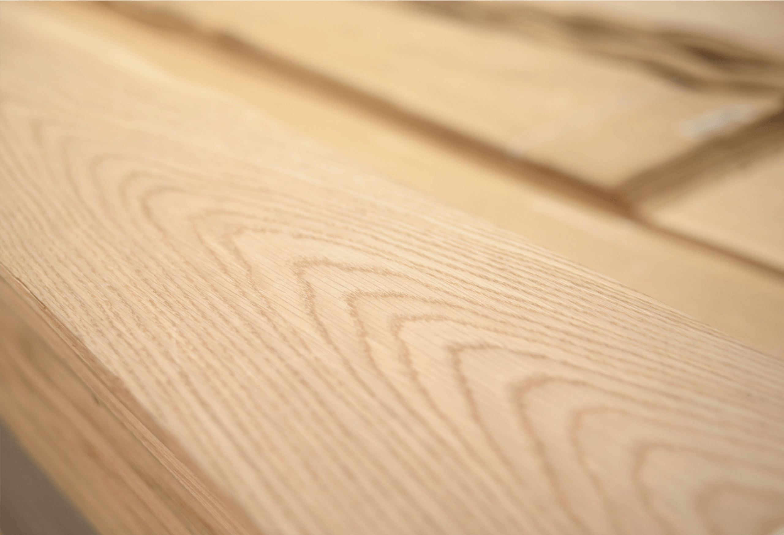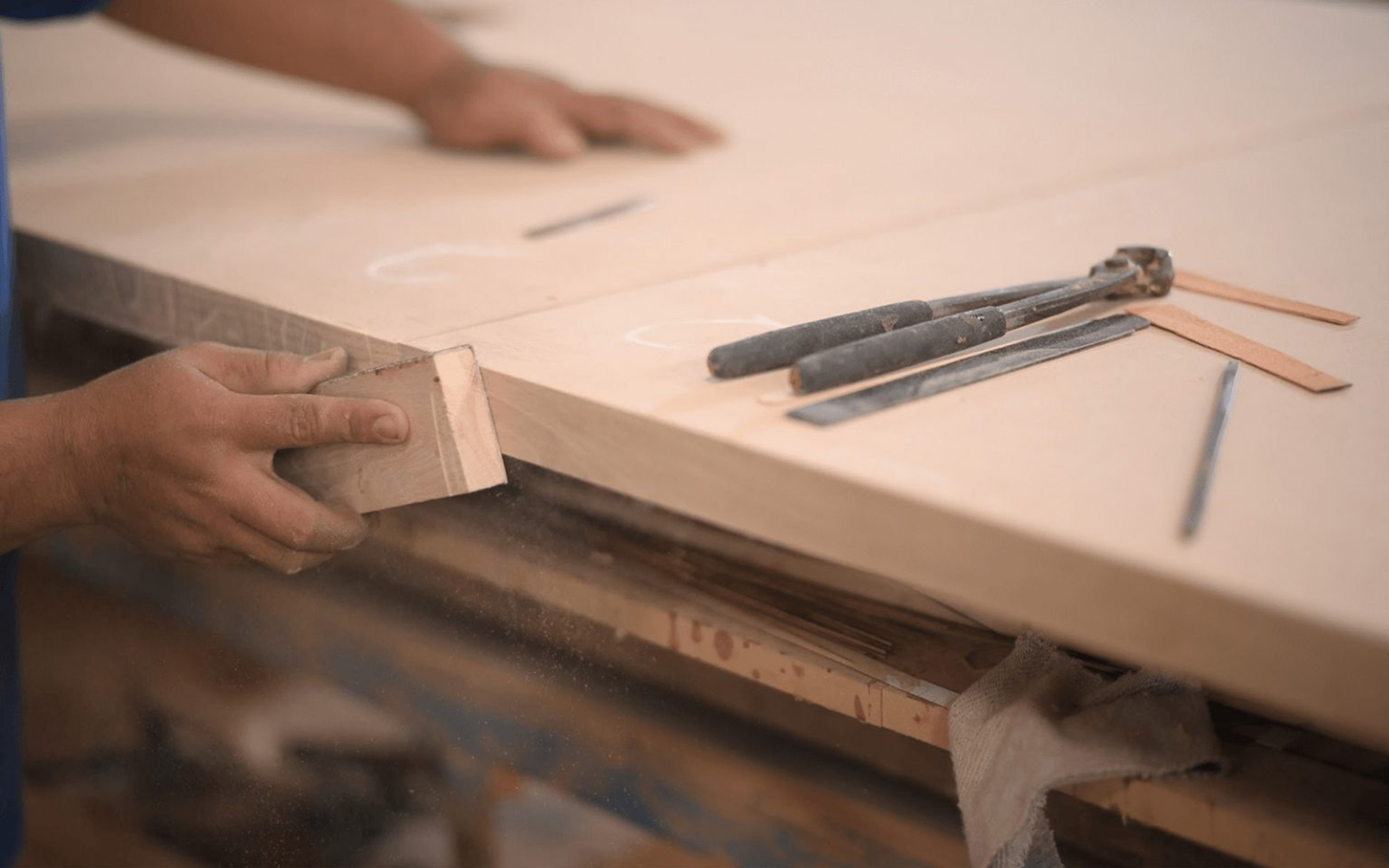 Once the veneer is set, the table tops are sanded by hand to prepare for polishing. NOMI uses a commercial grade polyurethane based finish that provides protection from day-to-day use while allowing the natural beauty of the timber to shine through.