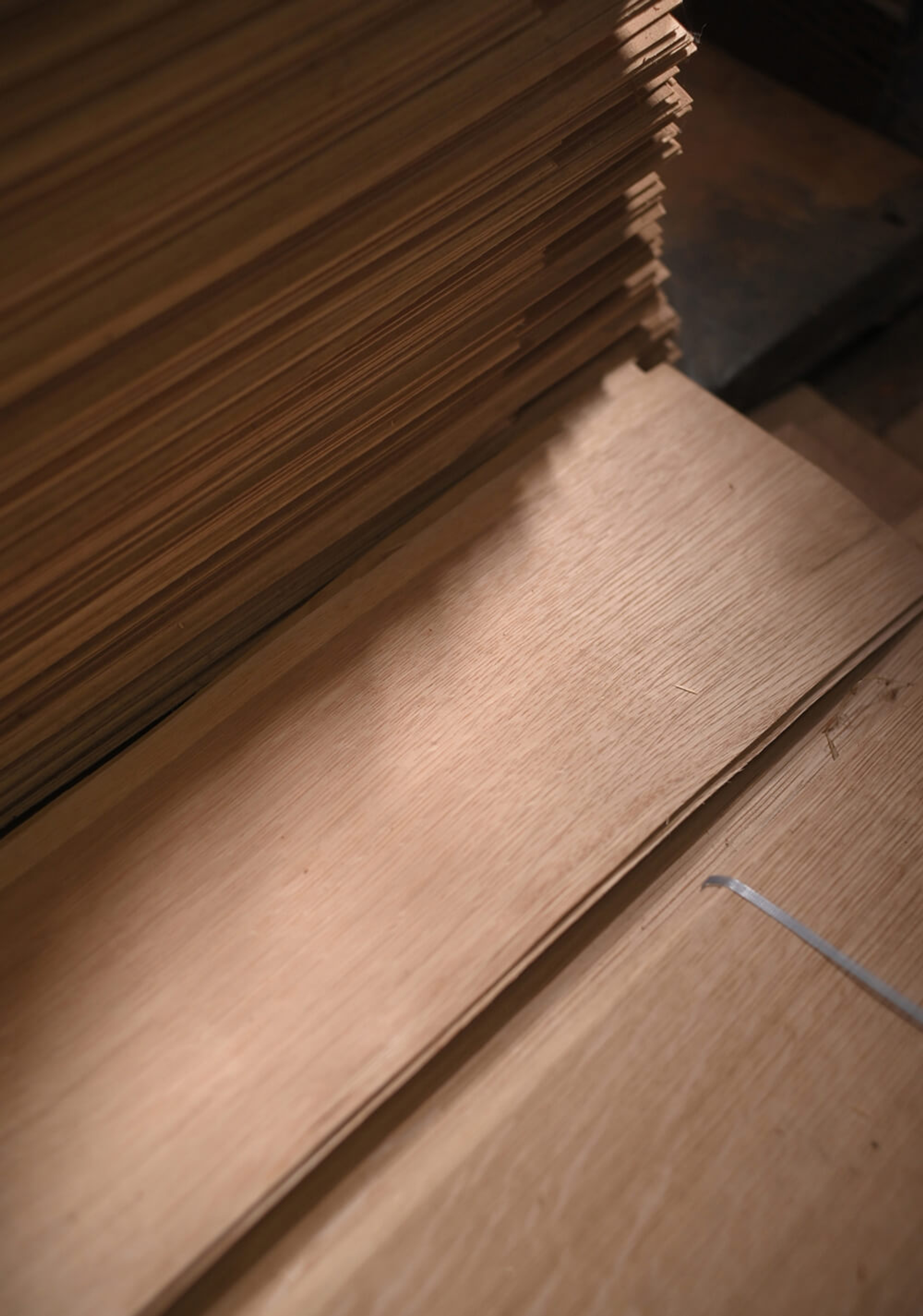 Veneer matching then occurs to identify how individual leaves will be joined together on the face of the panel. Table tops are then set to ensure component veneer patterns match across multiple sections.